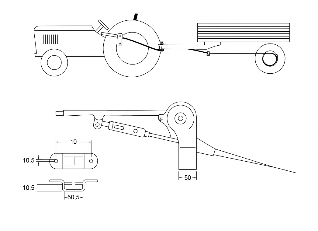 Komplet potezna ročica za ročno zavoro prikolice z jeklenico, ki je namenjana enoosnim prikolicam.