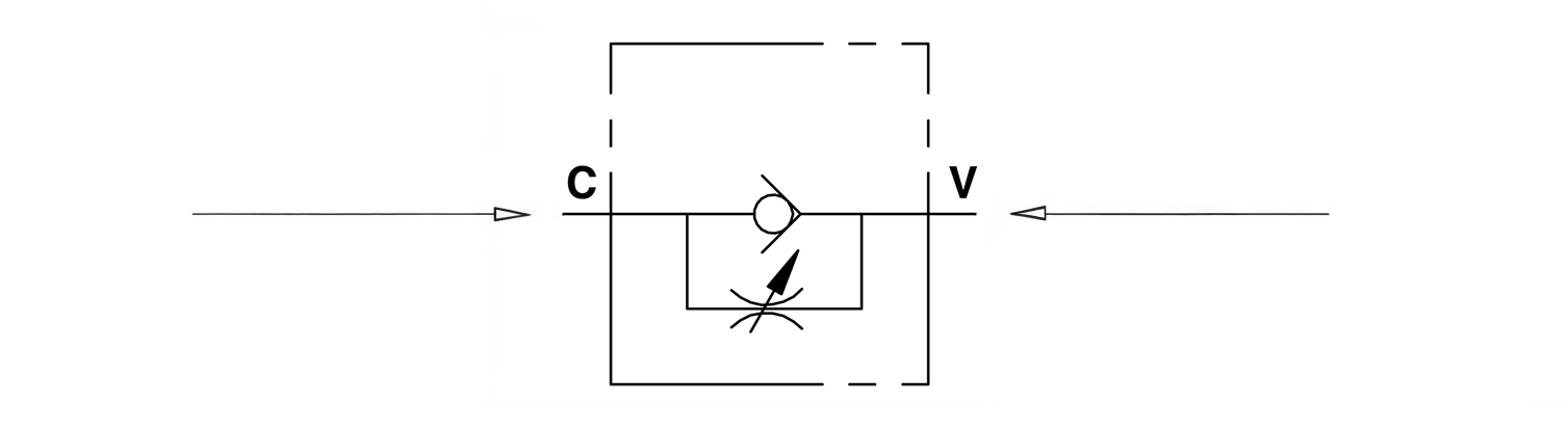 Priključek V povežite na tlačno stran, C pa na aktuator. Regulacija pretoka poteka iz C proti V, prost pretok pa v nasprotni smeri (V → C).