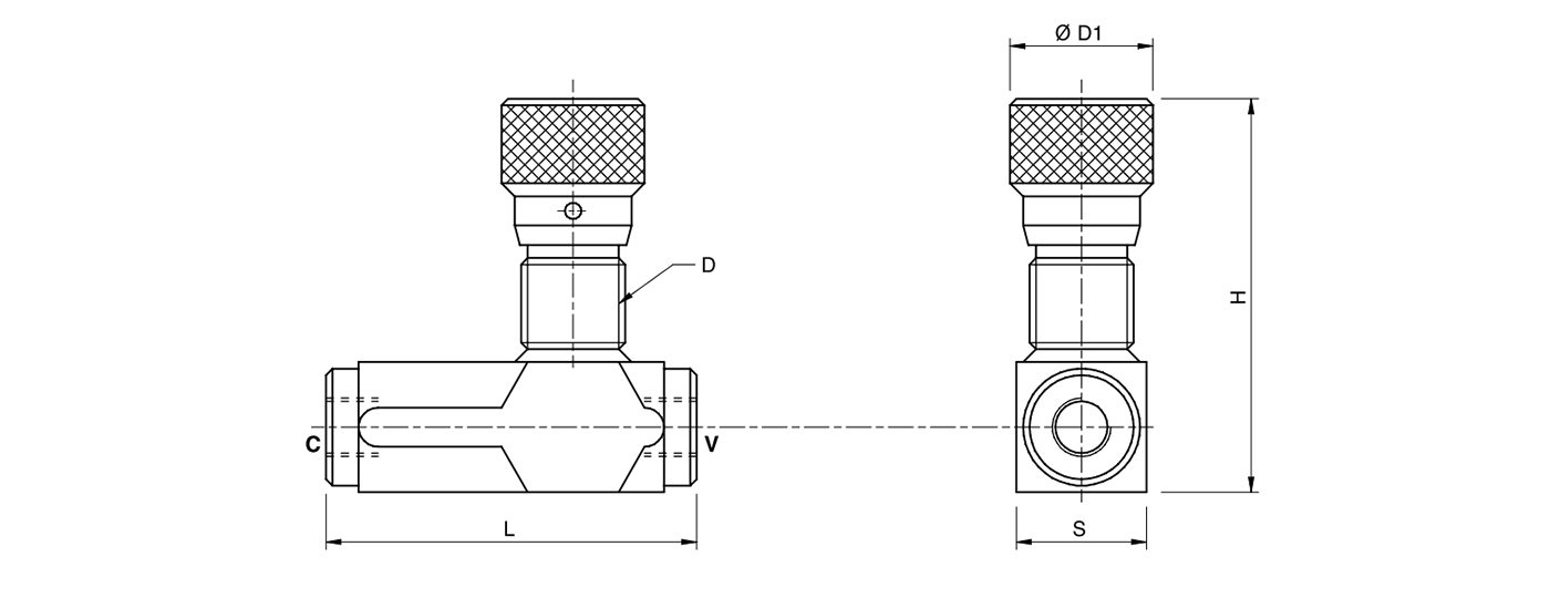 | OM Ref. | Tip | Max. pretok: | Max. tlak: | Navoj (V - C) | L | D | D1 | H (min - max) | S |