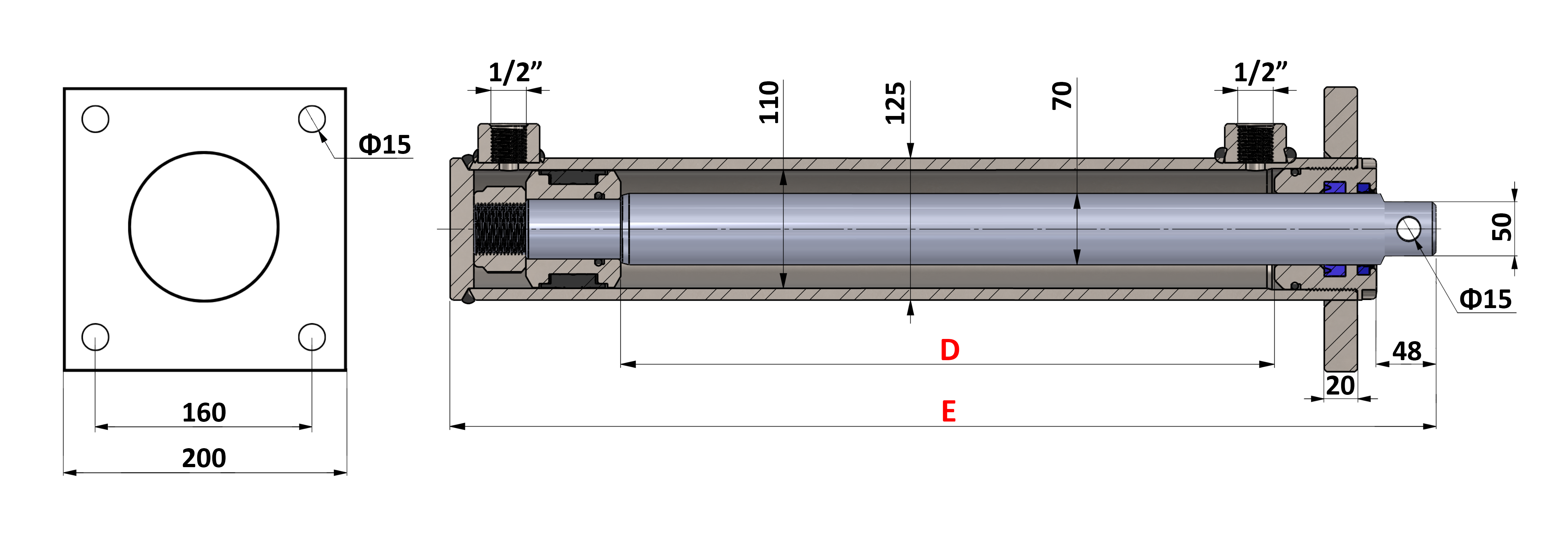 CILINDRO IDRAULICO CON PIASTRA DI MONTAGGIO 110/70-500