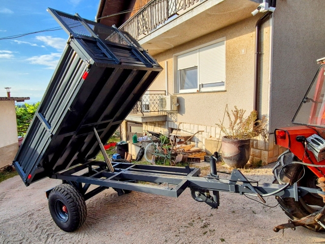 Stranka iz Belgije je imela prej na svoji traktorski prikolici le mehansko odpiranje zadnje stranice na prikolici. Zaradi večjega obsega dela je bilo odpiranje kar zamudno, zato je stranka predelala odpiranje na hidravlično. Potrebne so bile določene ojačitve in pa povezava obeh hidravličnih cilindrov s komandami v traktorski kabini. Stranka lahko sedaj odpira stranico prikolice kar iz kabine in ne rabi iti vedno ven pred kipanjem.