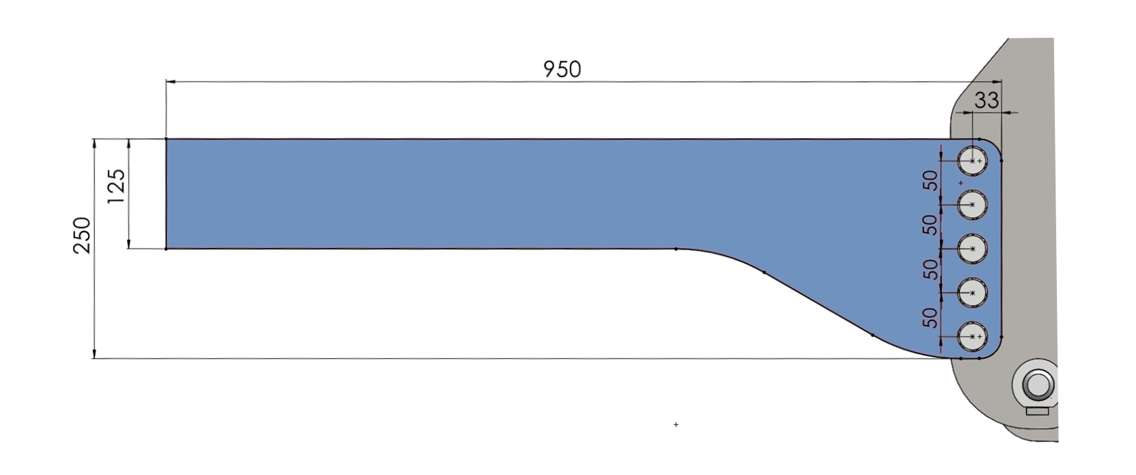Placa lungă de 950 mm poate fi tăiată la lungimea dorită, iar găurile de montaj sunt găurite conform tractorului.